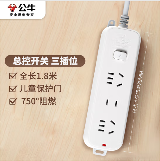 公牛(BULL)插座/插線板/插排/排插/接線板/拖線板 3位總控全長(zhǎng)1.8米