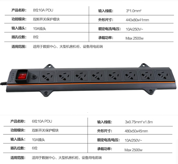圖騰(TOTEN)PDU機(jī)柜插座 8位10A電源分配器/分配單元 工業(yè)插座/插線板/連接器 帶開關(guān)1.8米線
